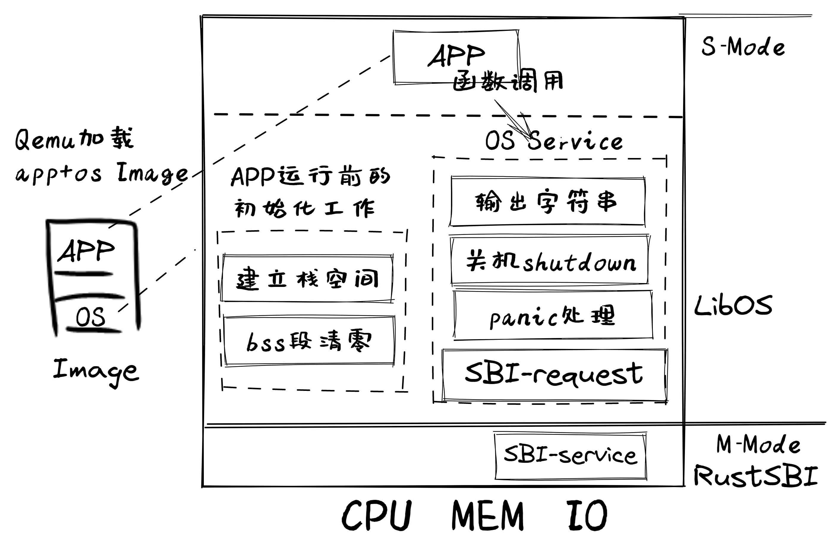 我们想用 Rust 语言来实现内核的大多数功能,因此我们需要进一步将控制权从第一条指令转交给 Rust 入口函数。在 Rust 代码中,函数调用是不可或缺的基本控制流,为了使得函数调用能够正常进行,我们在跳转到 Rust 入口函数前还需要进行栈的初始化工作。为此我们详细介绍了函数调用和栈的相关背景知识,具体内容可参考 为内核支持函数调用 一节。最终,我们调用软件栈中相比内核更低一层的软件——也即 RustSBI 提供的服务来实现格式化输出和遇到致命错误时的关机功能,形成了LibOS的核心功能,详情参考 基于 SBI 服务完成输出和关机 一节。至此,应用程序可以直接调用LibOS提供的字符串输出函数或关机函数,达到让应用与硬件隔离的操作系统目标。