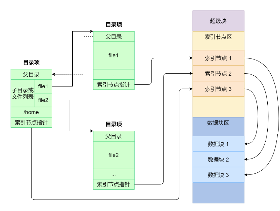 Blocks 给出 os 目录也占用 8 个块进行存储。实际上目录也可以看作一种文件,它也有属于自己的底层编号,它的内容中保存着若干 目录项 (Dirent, Directory Entry) ,可以看成一组映射,根据它下面的文件名或子目录名能够查到文件和子目录在文件系统中的底层编号,即 Inode 编号。但是与常规文件不同的是,用户无法 直接 修改目录的内容,只能通过创建/删除它下面的文件或子目录才能间接做到这一点。