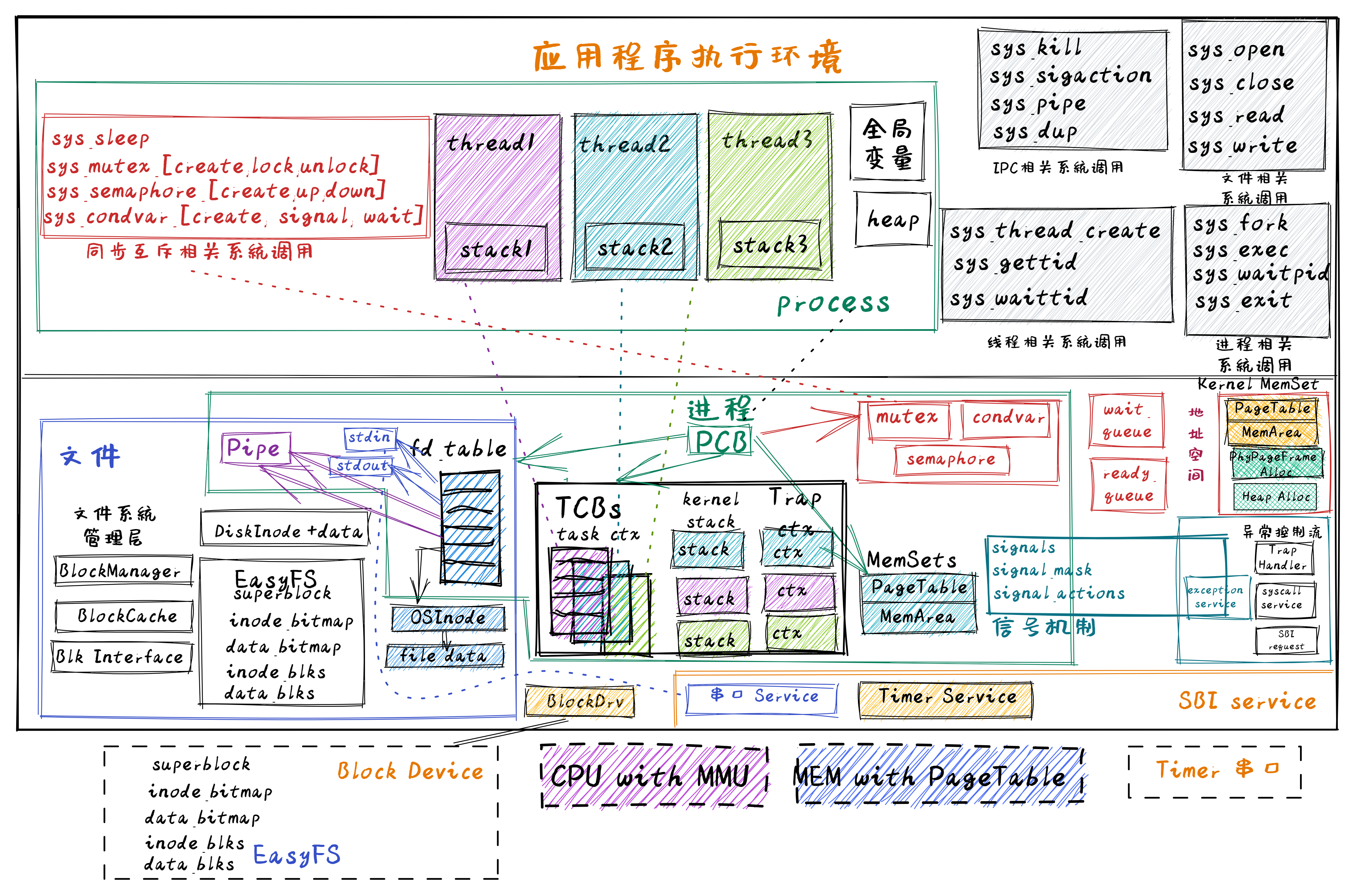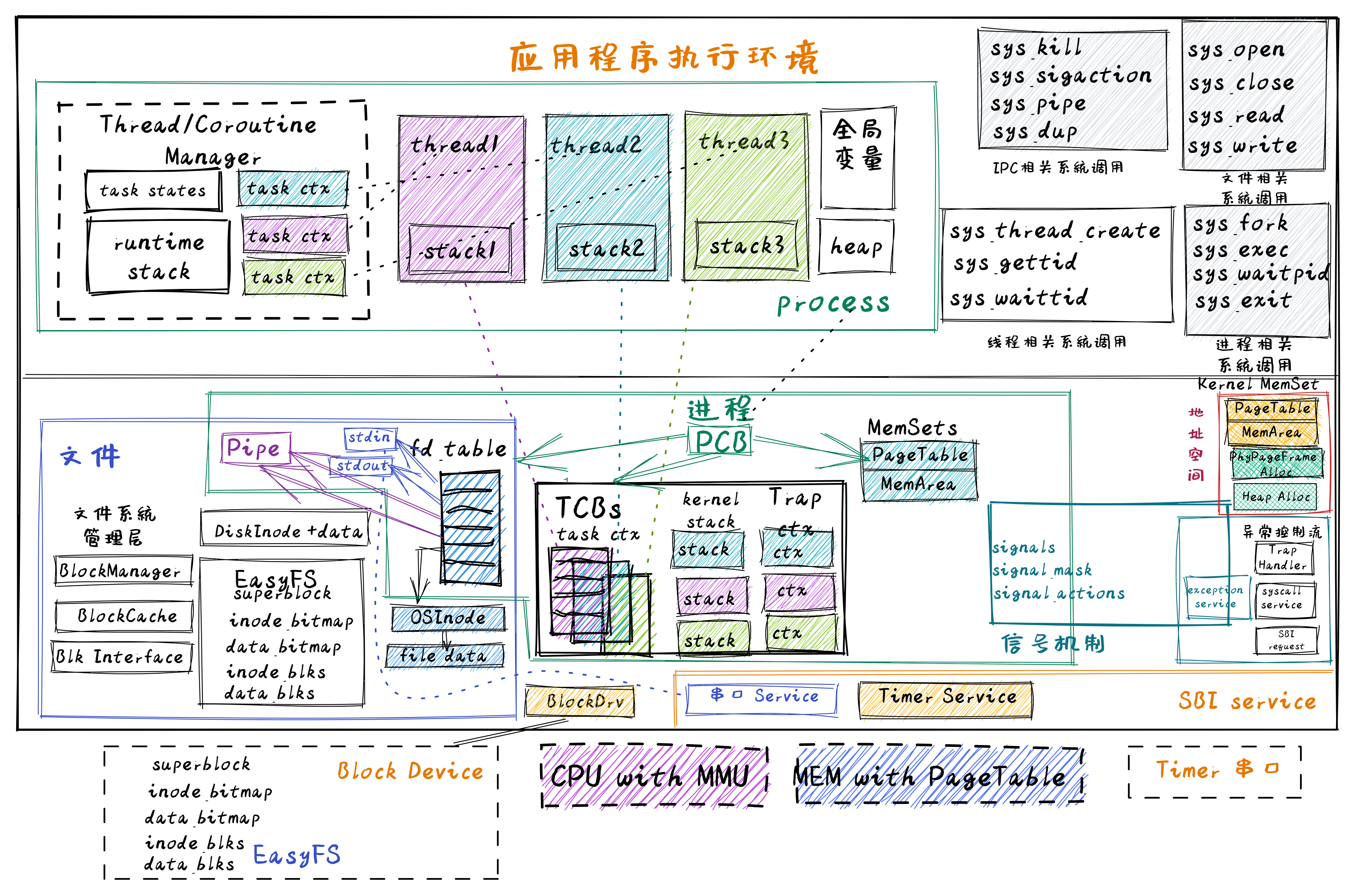 在 内核态的线程管理 一节中讲述了在操作系统内部设计实现内核态线程管理的实现过程,这其实基于第三章中 任务切换的设计与实现 和 抢占式调度 的进一步改进实现。这涉及到对进程的重构,把以前的线程管理相关数据结构转移到线程控制块中,并把线程作为一种资源,放在进程控制块中。这样与线程相关的关键部分包括: