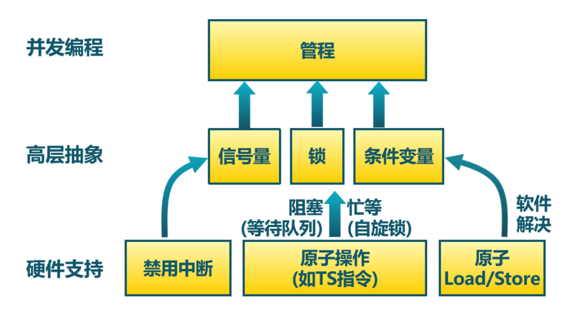 entry关键字(见第 12 行)描述。编程语言保证同一时刻最多只有一个活跃线程在执行管程中的过程,这保证了线程并发调用管程过程的时候能保证管程中共享资源的互斥访问。管程是编程语言的组成部分,编译器知道其特殊性,因此可以采用与其他过程调用不同的方法来处理对管程的调用,比如编译器可以在管程中的每个过程的入口/出口处自动加上互斥锁的获取/释放操作。这一过程对程序员是透明的,降低了程序员的心智负担,也避免了程序员误用互斥锁而出错。条件同步 :管程还支持线程间的条件同步机制,它也是基于阻塞等待的,因而也分成阻塞和唤醒两部分。对于阻塞而言,第 14 行发现条件不满足,当前线程需要等待,于是在第 16 行阻塞当前线程;对于唤醒而言,第 17~18 行的执行满足了某些条件,随后在第 20 行唤醒等待该条件的线程(如果存在)。